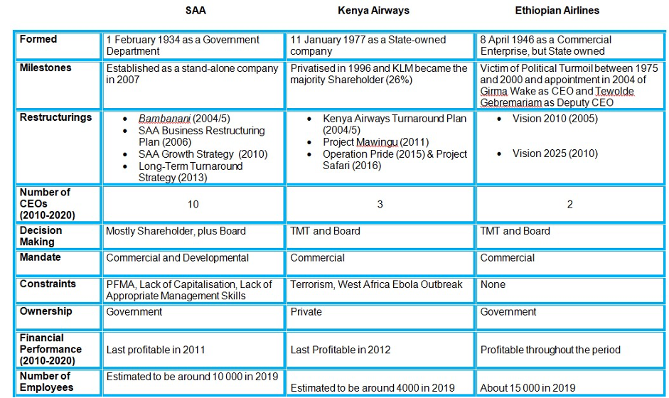With all the aforementioned challenges, there was no way that SAA’s LTTS could be implemented successfully. The situation was very different at Kenya Airways (although this airline was also unsuccessful in implementing its turnaround strategy, Operation Pride, albeit for different reasons) and Ethiopian Airlines. Some of the key differences among the three airlines are listed in the figure below: